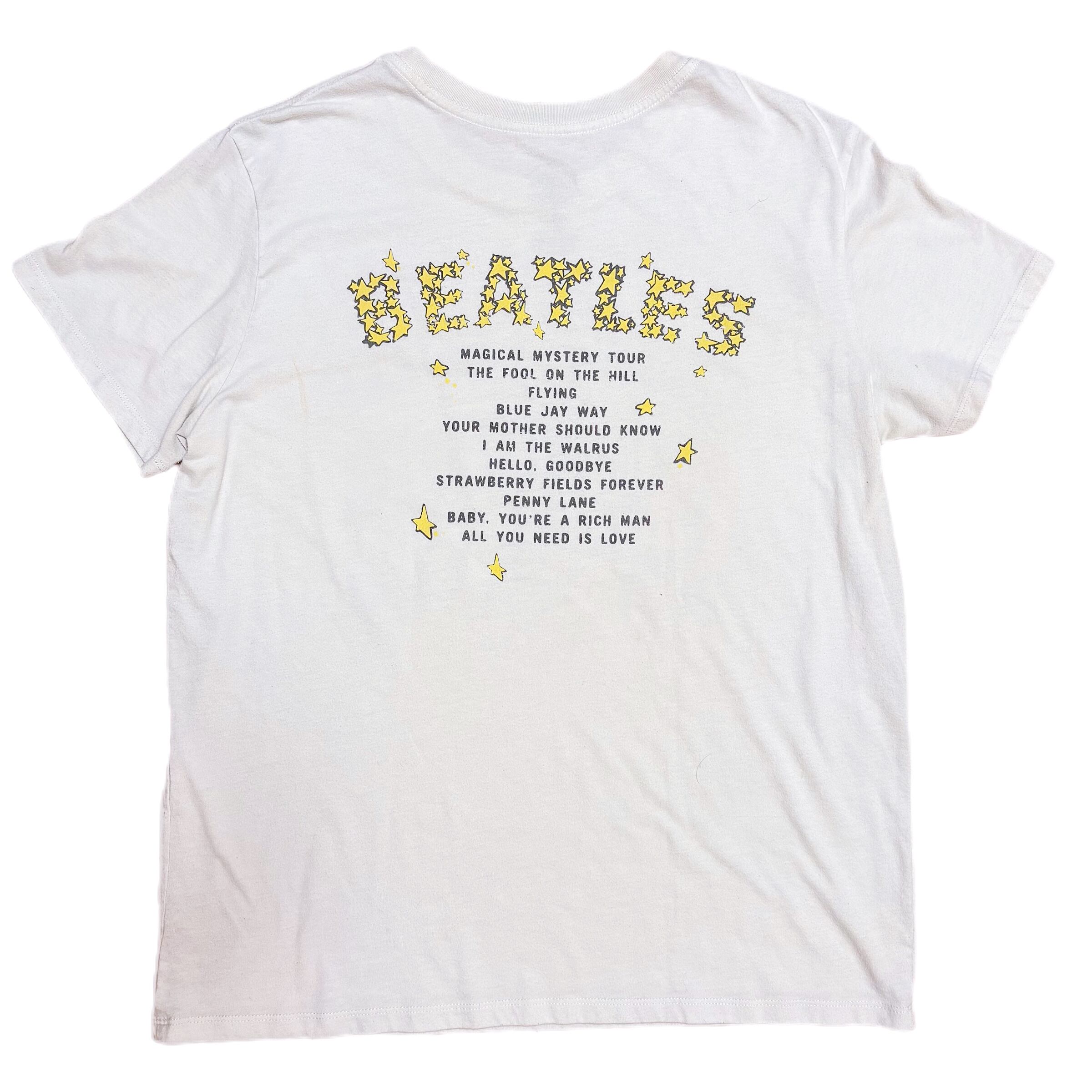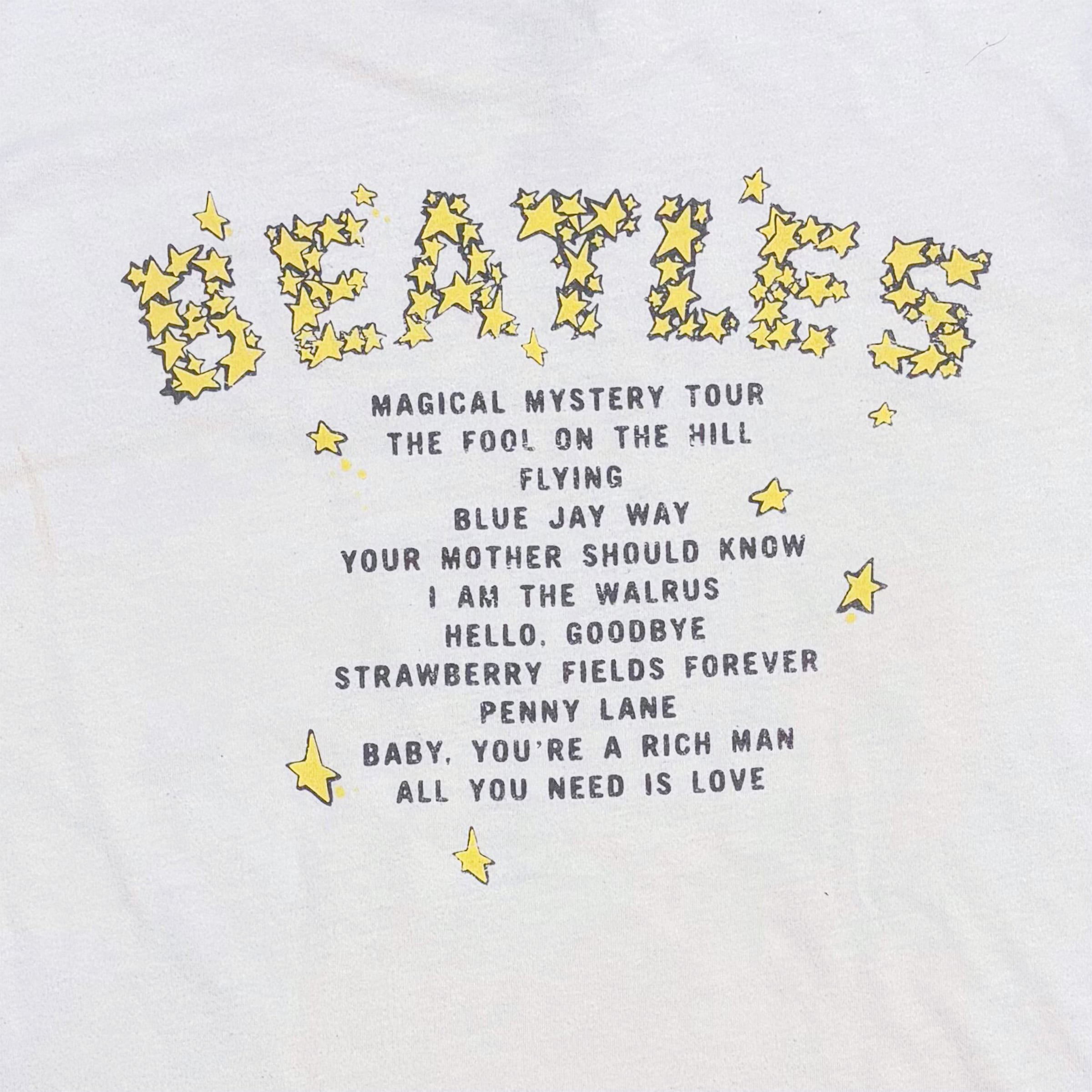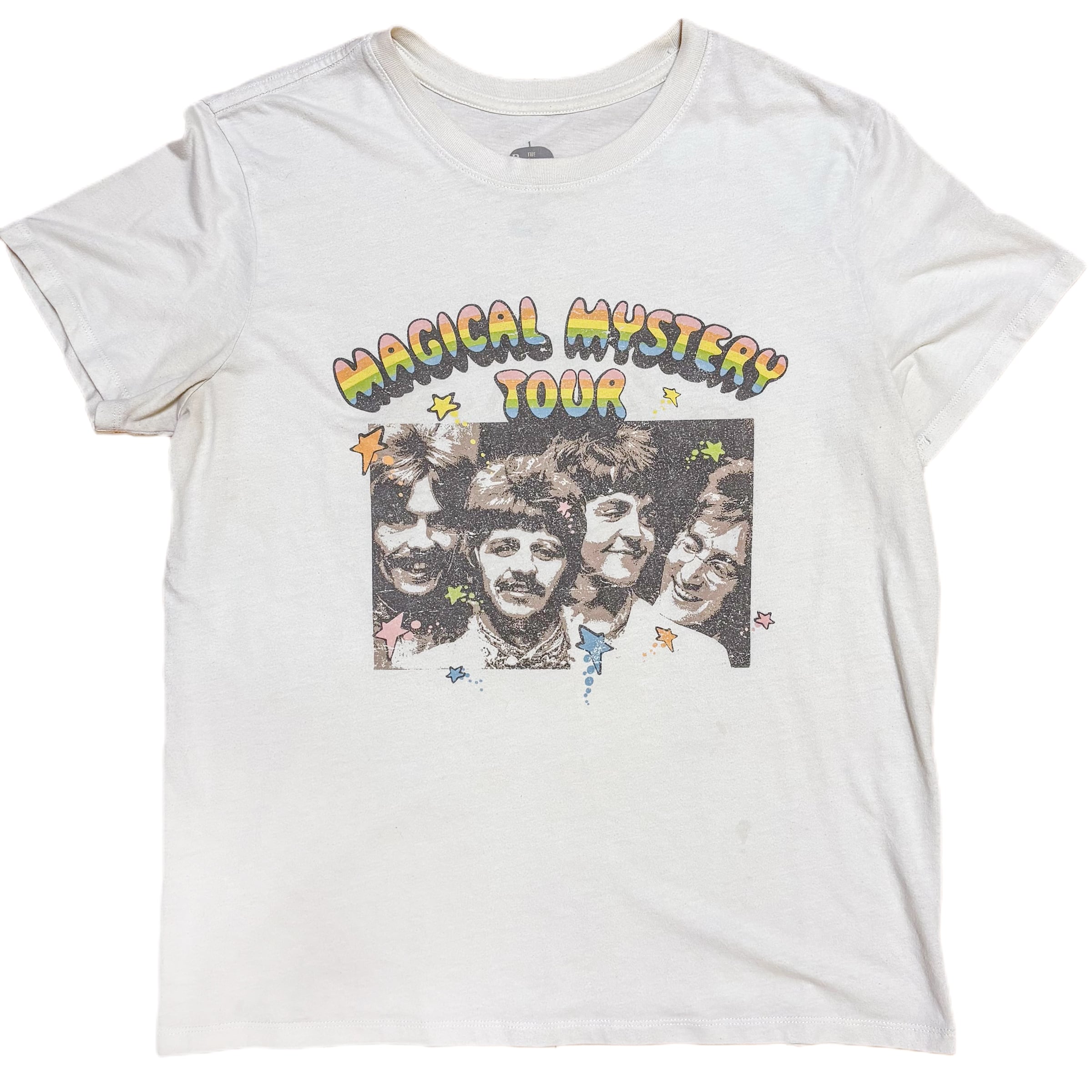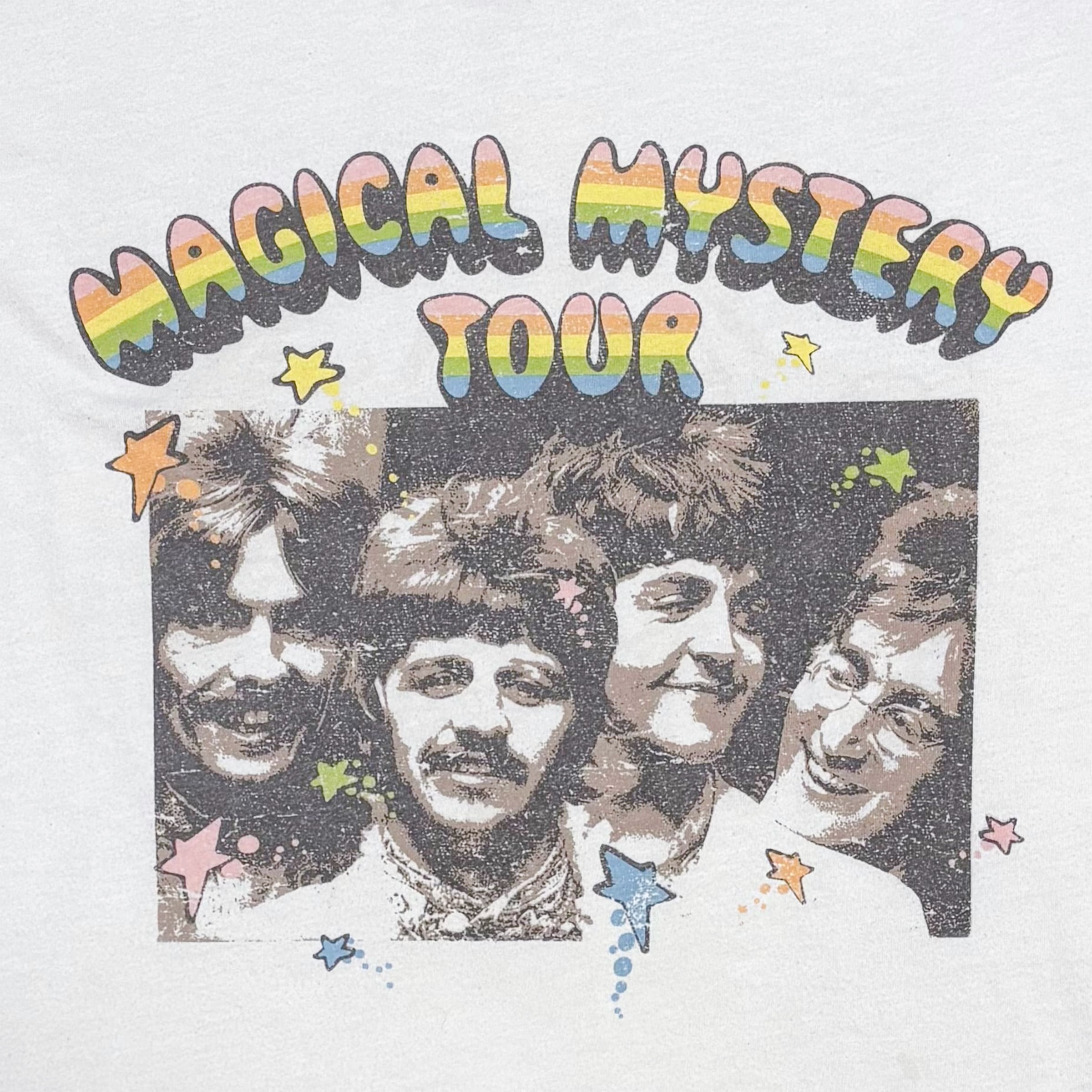 ビートルズの名盤「Magical Mystery Tour」がプリントされたヴィンテージライクな一枚。カラフルなロゴと4人のメンバーのプリントが存在感抜群で、ファンにはたまらないデザイン。