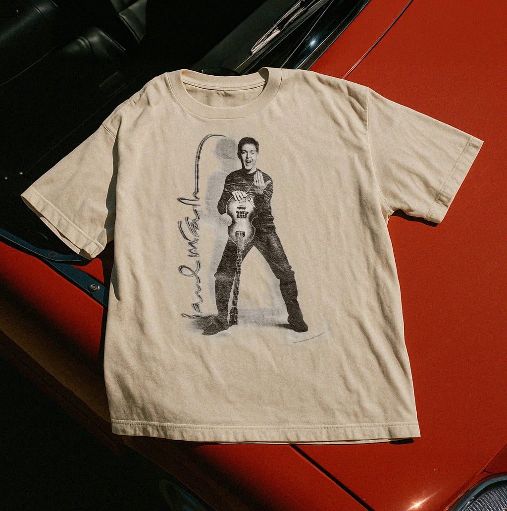 躍動感あふれるポールのフォトプリントに加え、彼の直筆風サインデザインも大胆にレイアウトされたファン垂涎の一枚です。