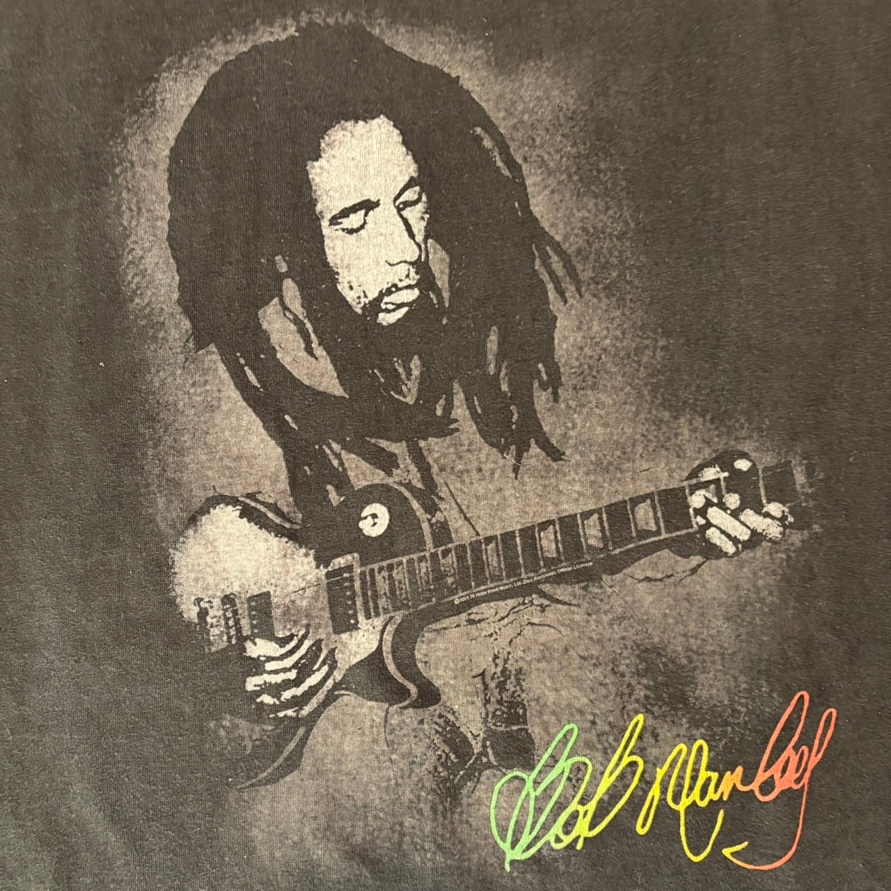 レゲエの象徴・Bob Marleyの公式プリントTシャツ。ギターを弾く姿がモノクロで描かれ、胸元にはラスタカラーのサイン風ロゴを配置。ブラックボディは経年によるフェードが美しく、古着ならではの味を楽しめます。ゆったりとしたシルエットでデイリーにも取り入れやすく、音楽好き・レゲエファン必携の一枚です。