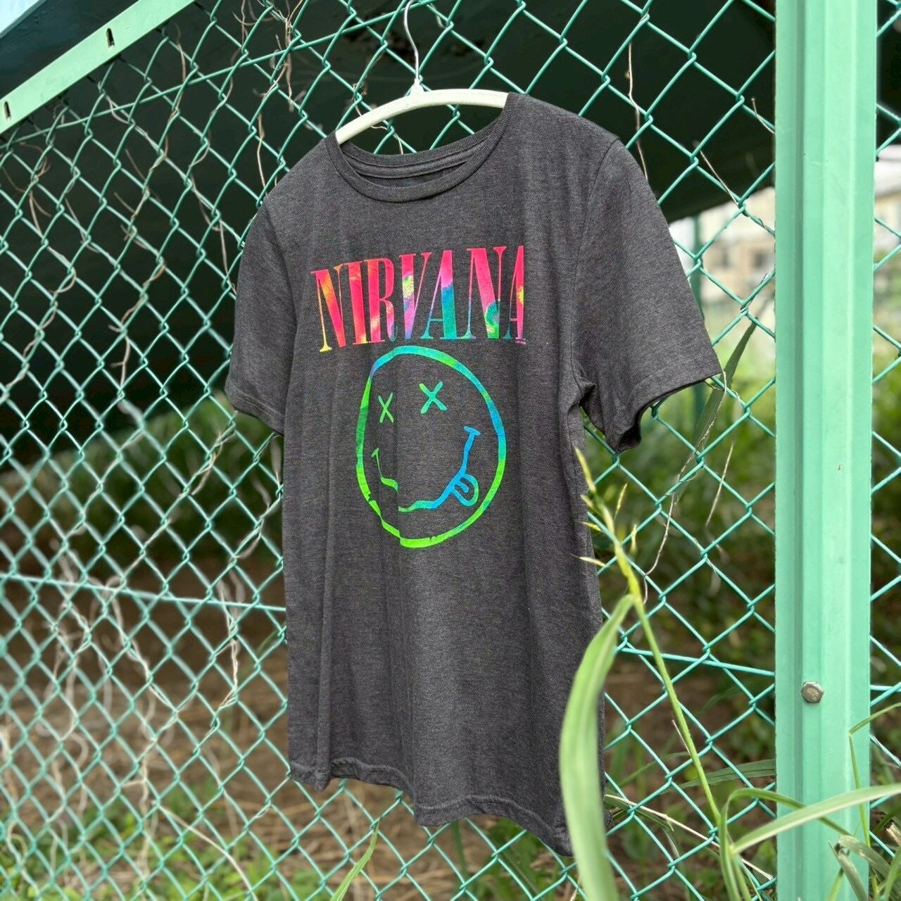 伝説的なグランジバンド「ニルヴァーナ(Nirvana)」のアイコニックなスマイルロゴがデザインされたTシャツです。