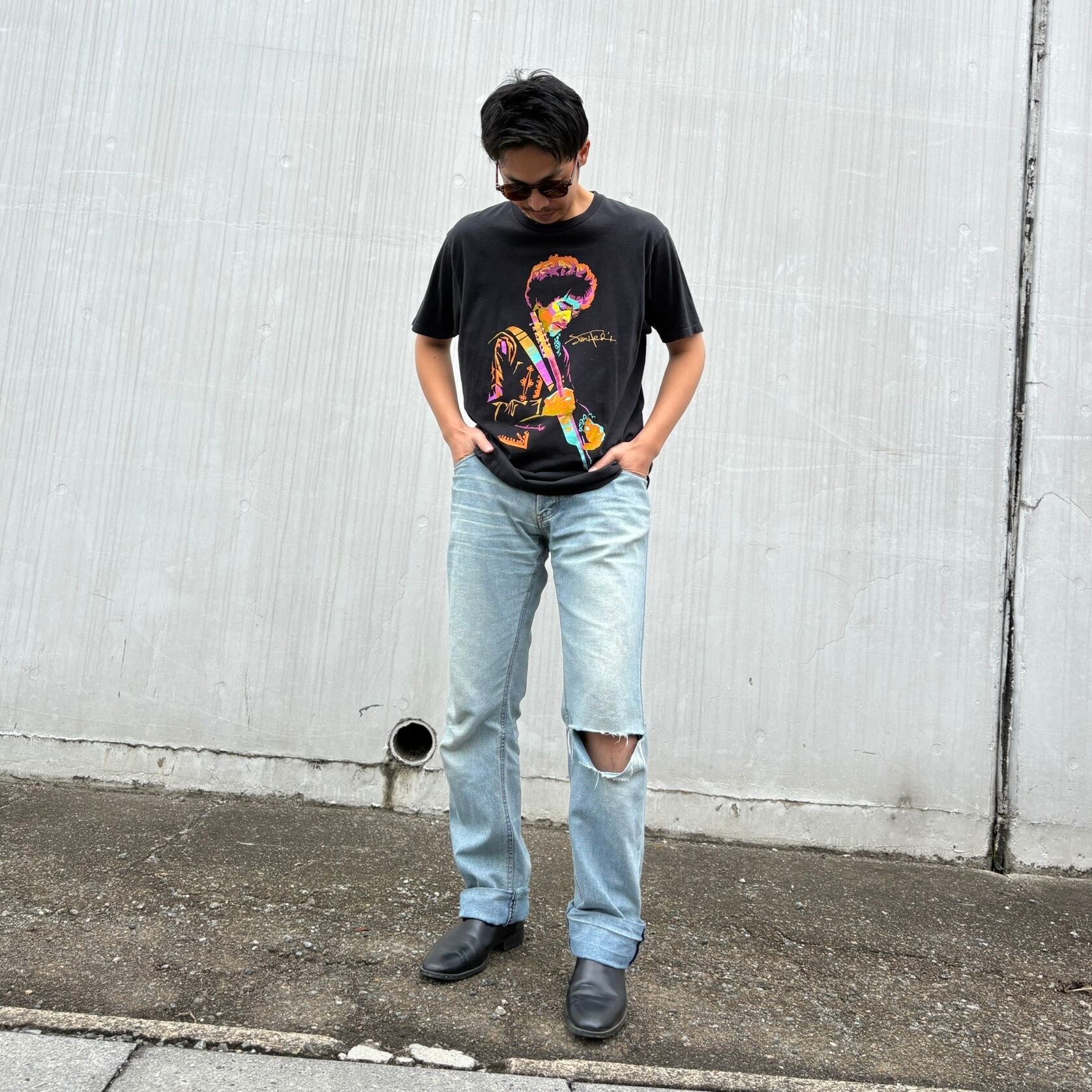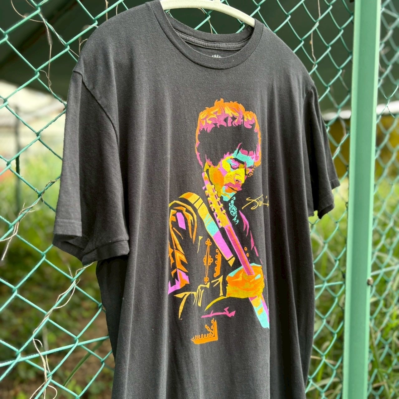 伝説的なギタリスト、ジミ・ヘンドリックスのアートデザインが施されたブラックTシャツです。鮮やかなマルチカラーのグラフィックが、存在感を放つ一枚。ファンにはたまらないヴィンテージ感と独自の雰囲気が魅力です。